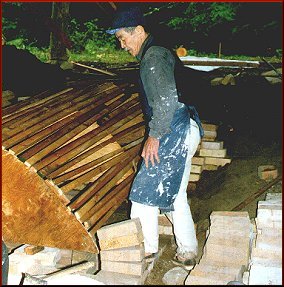 Dr. Yukio Yamamoto building the wooden form of the Hutchens' anagama kiln